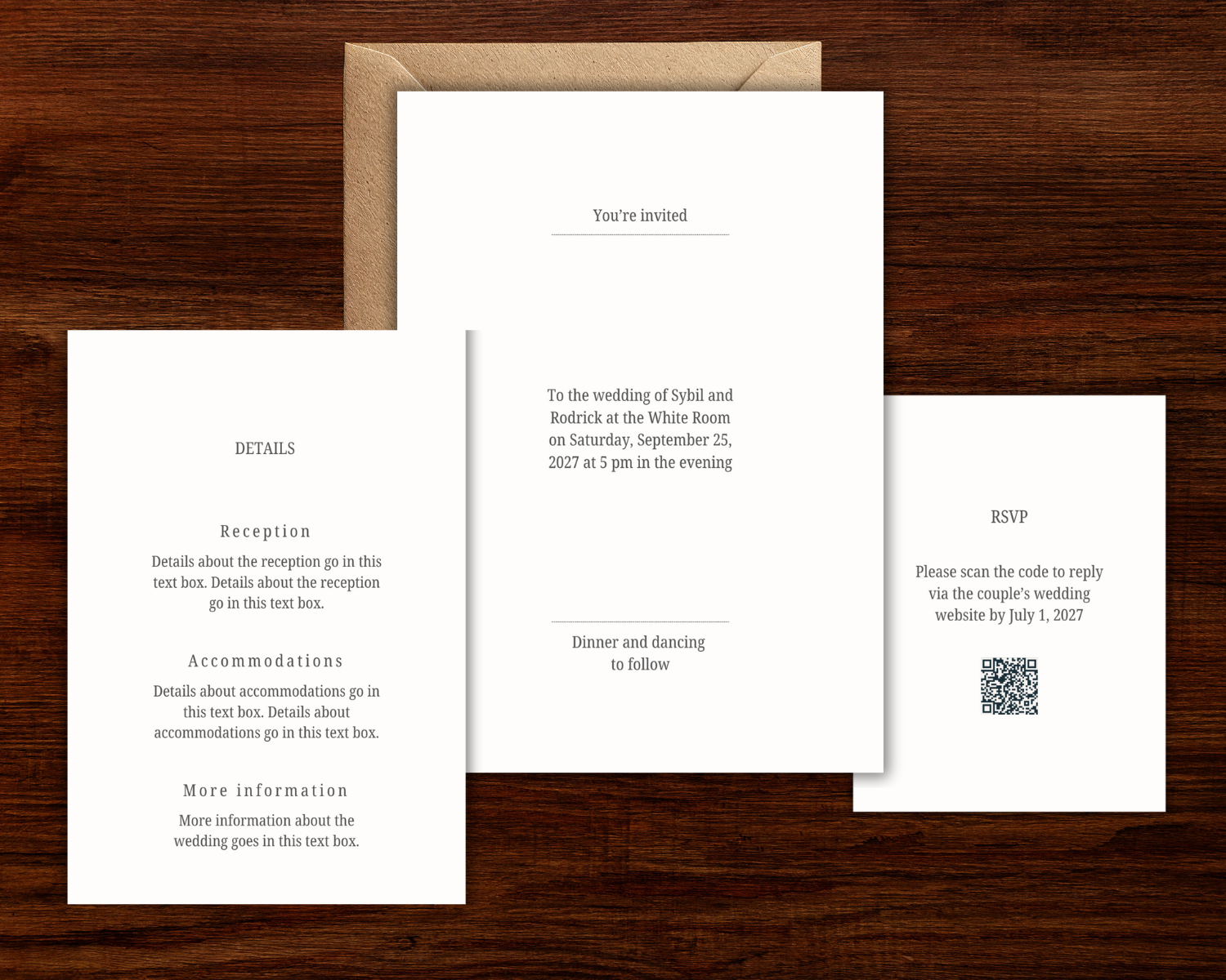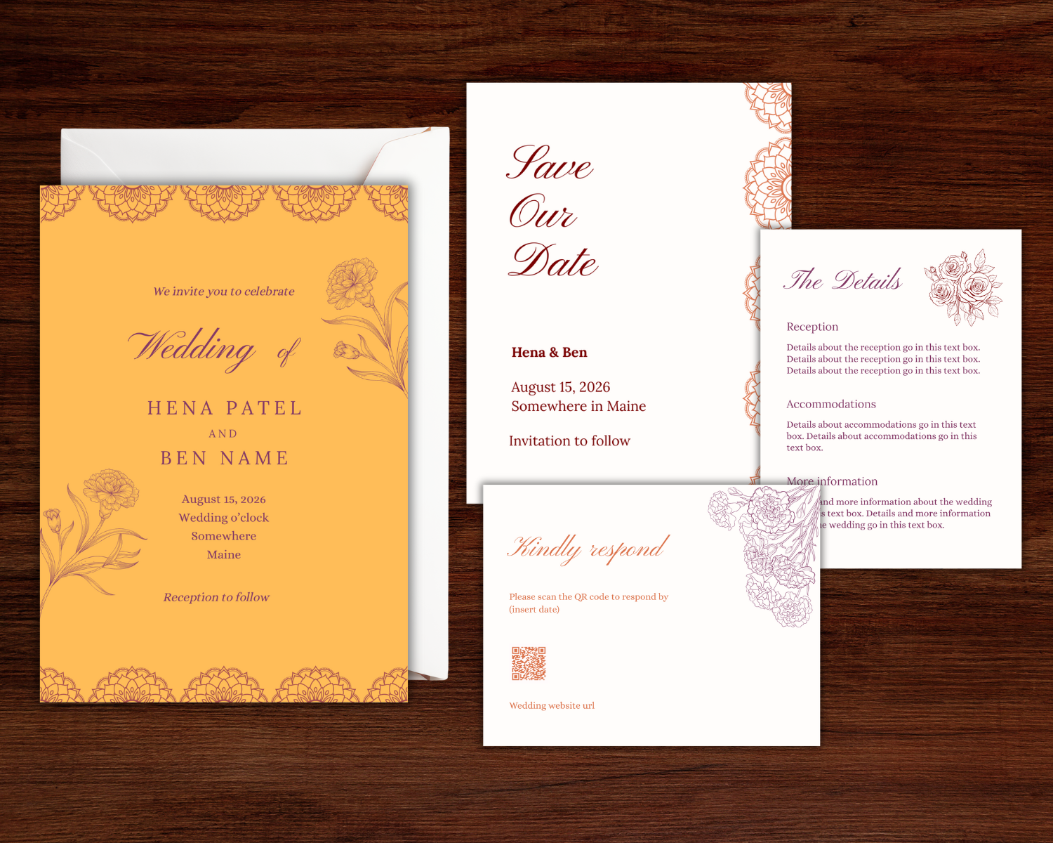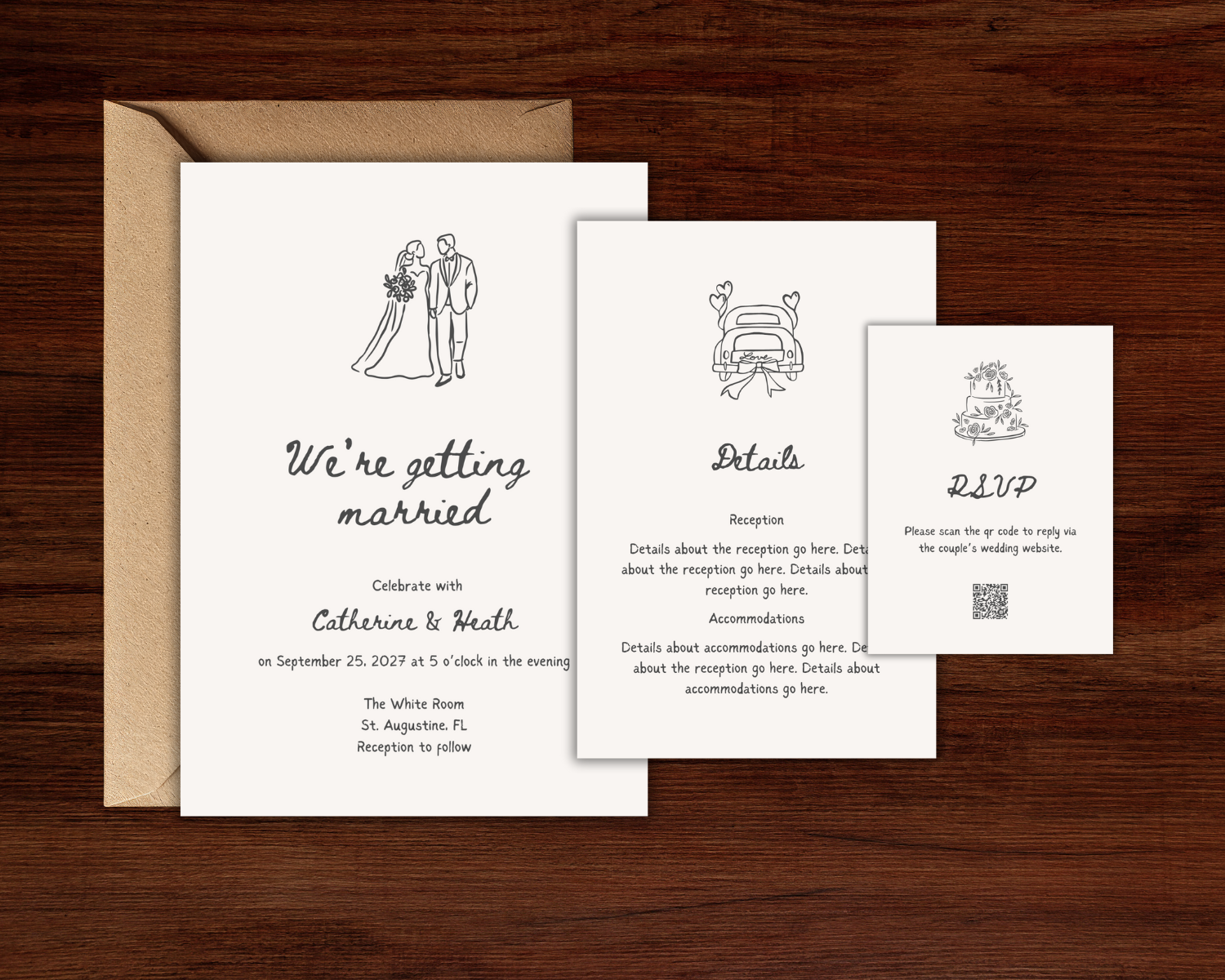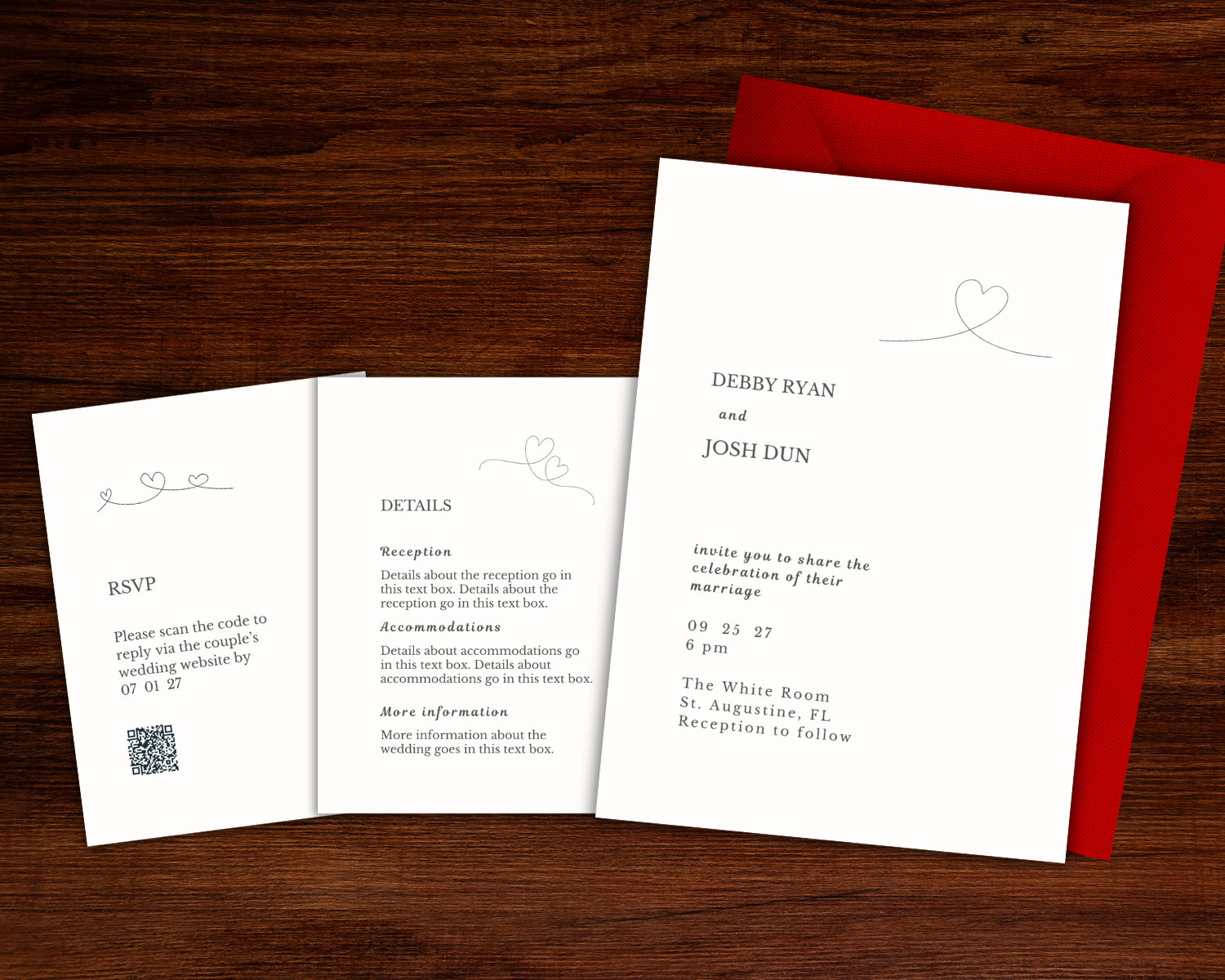Elevate your wedding day with a full stationery suite featuring all traditional paper details. Select from our pre-designed options and let’s get the show on the road. Colors and fonts can be modified with no additional charge.